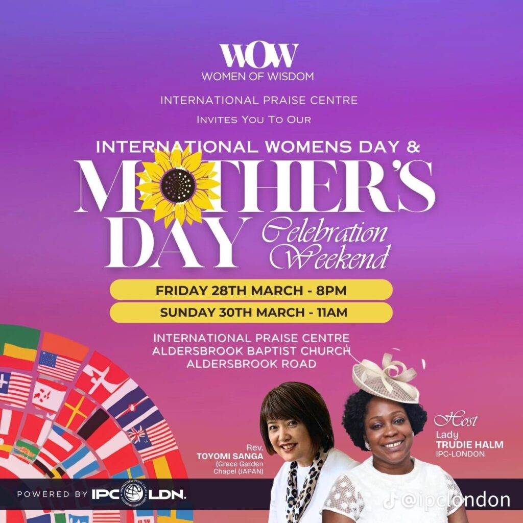 The International Praise Centre (IPC) is set to host a power-packed International Women’s Day & Mother’s Day Celebration Weekend, organized by Women of Wisdom (WOW). The two-day event will take place on Friday, March 28, at 8 PM, and Sunday, March 30, at 11 AM, at Aldersbrook Baptist Church, Aldersbrook Road.